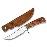 Featured on the 440 stainless steel blade of this knife is a double blood groove and a full tang construction. The blade is set into a genuine pakkawood handle. A laser etched elk ridge blade detail completes the look of this knife, A genuine leather sheath is included. 9 1/2 inch overall length.